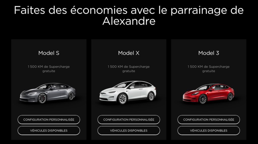 Pour le moment, le programme de parrainage n’a pas encore évolué. Numerama a pu le vérifier en demandant un lien à Alexandre, propriétaire d’une Tesla Model 3. Un clic envoie vers une page web qui offre l’opportunité de commander l’une des quatre voitures disponibles dans le catalogue. Les 1 500 kilomètres gratuits sont toujours garantis.