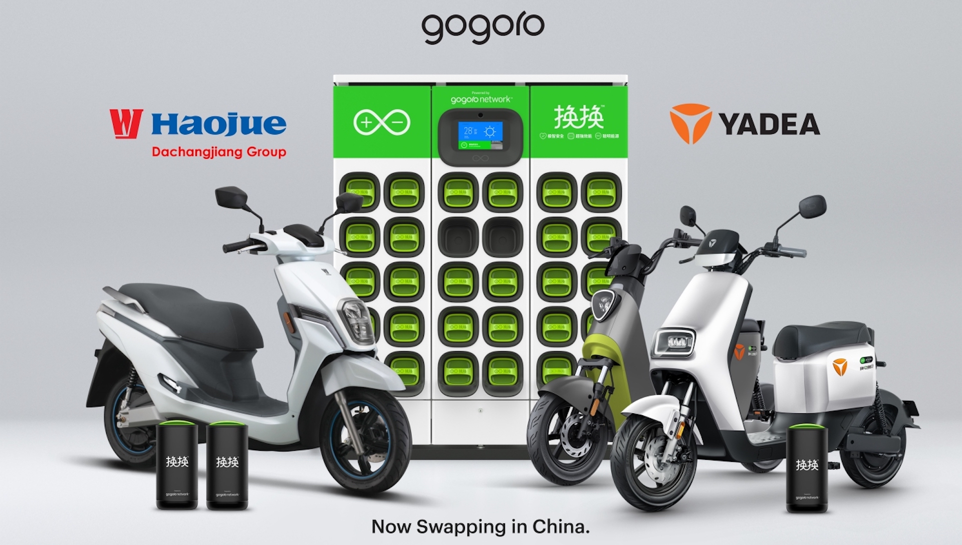 Les constructeurs Yadea et DCJ sont mis en avant dans la campagne publicitaire de lancement de Gogoro en Chine : les deux entreprises ont développé spécialement des scooters compatibles avec les batteries de Gogoro. Le fabricant taïwanais dispose toutefois de deux-roues électriques à lui (très attendus), qu’il continue à commercialiser — on avait d’ailleurs pu les apercevoir en France entre 2018 et 2019, sous la marque de scooters en libre-service COUP.